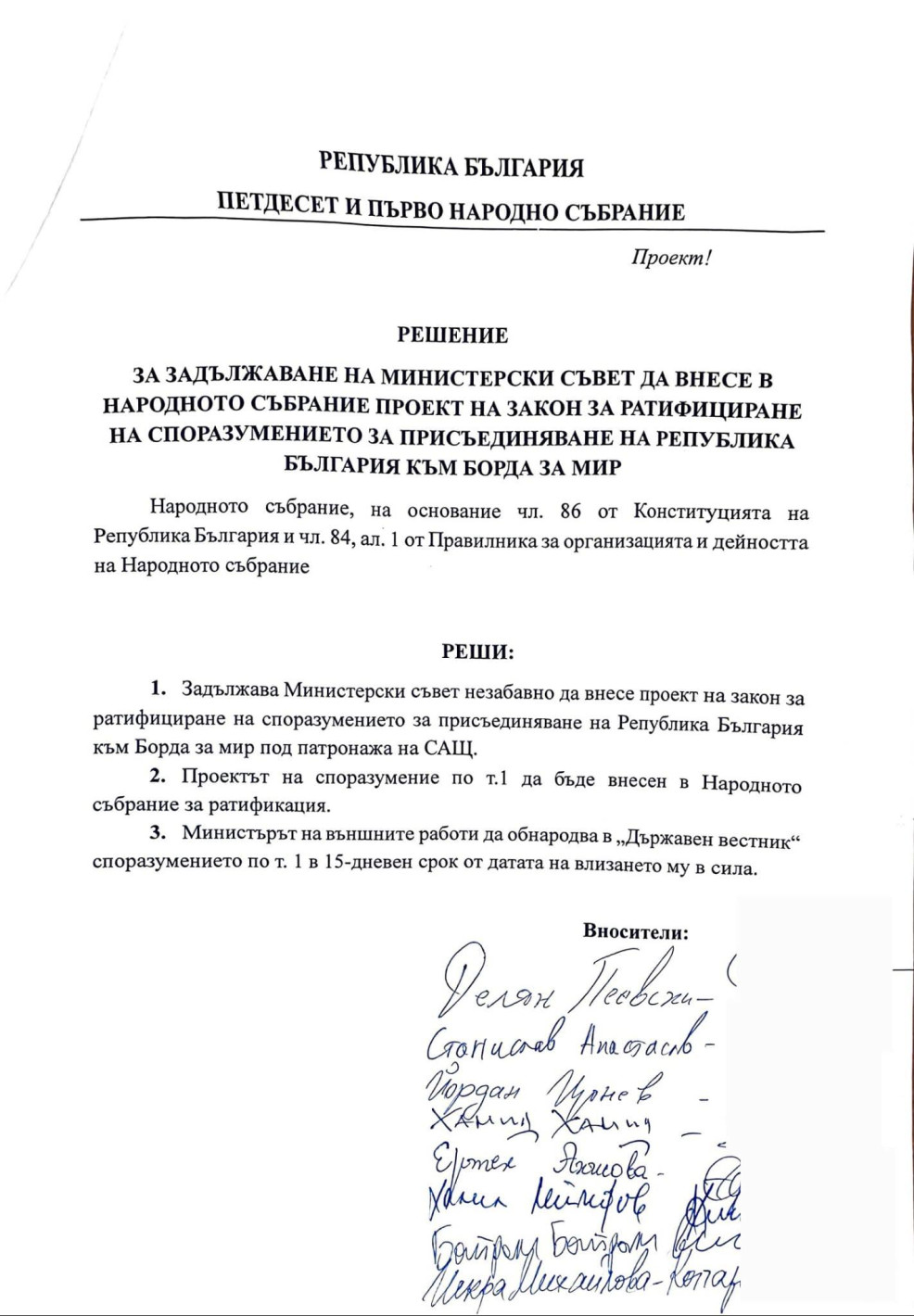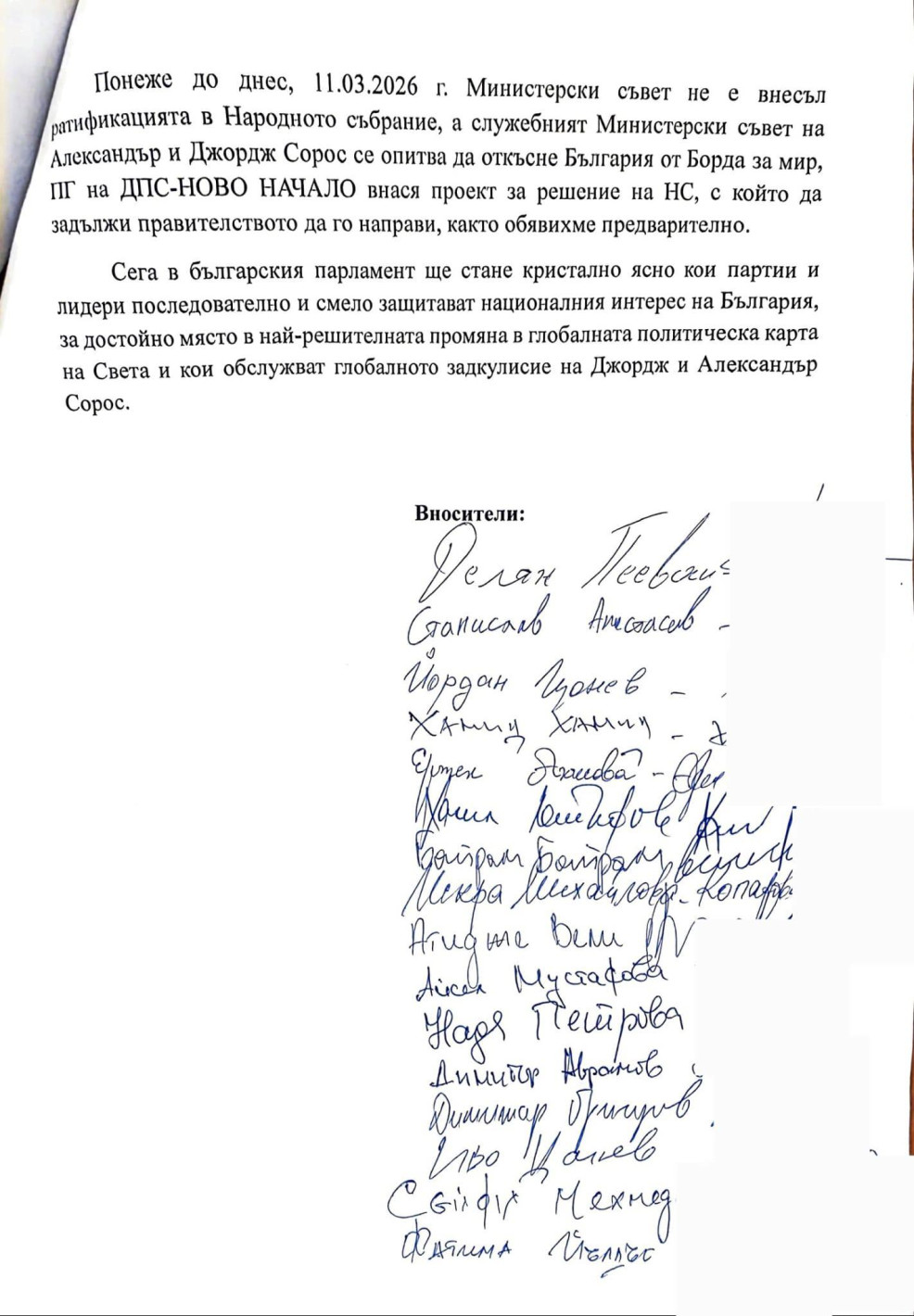 ДПС-НОВО НАЧАЛО внася в парламента проект на решение за задължаване на Министерски съвет да внесе в Народното събрание проект на закон за ратифициране на споразумението за присъединяване на Република България към Борда за мир.