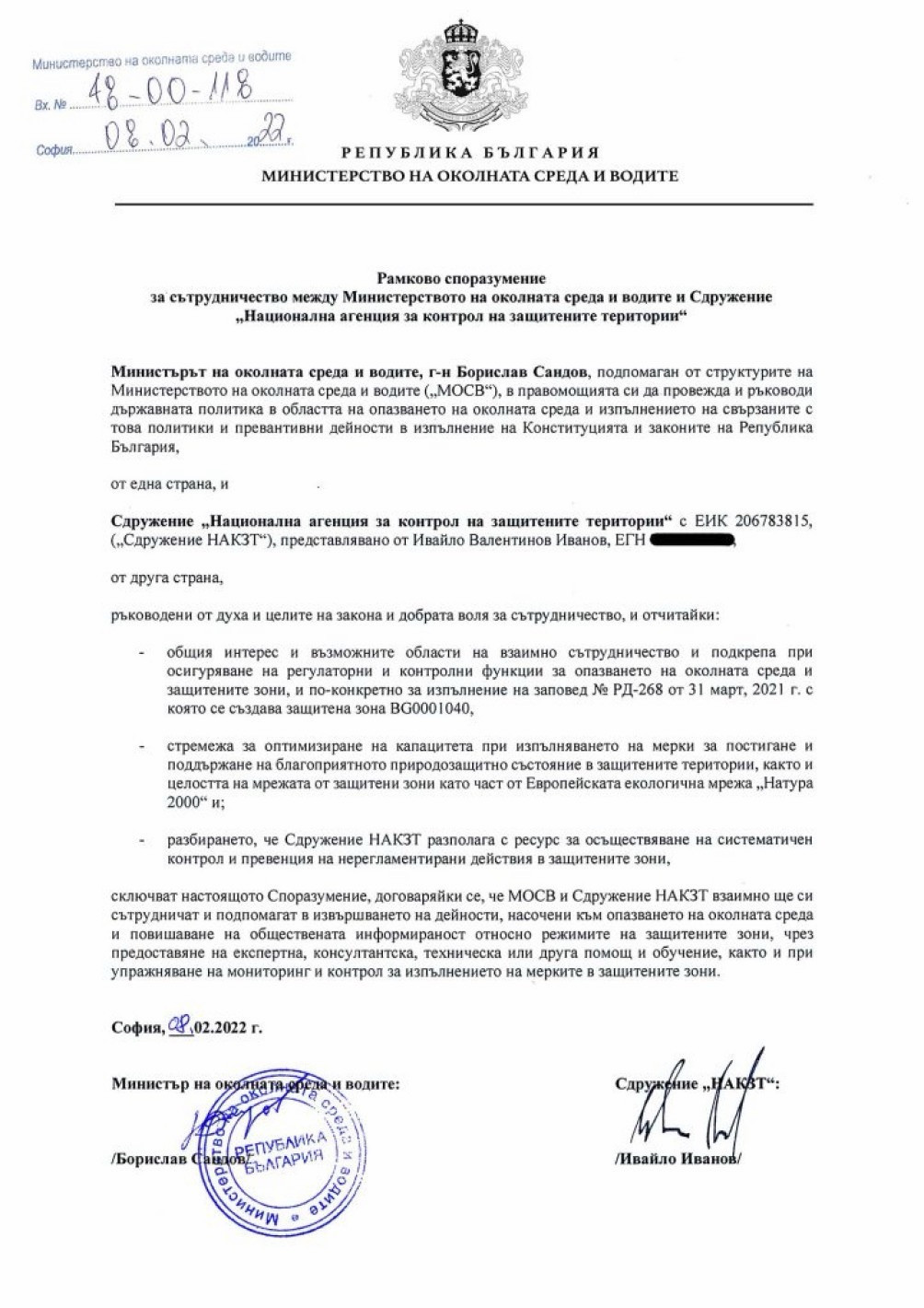 Само 27 дни след регистрацията на организацията и едва 58 дни след старта на кабинета „Петков“, на 8 февруари 2022 г., Борислав Сандов подписва рамково споразумение за сътрудничество между Министерството на околната среда и водите и новоучреденото НПО.